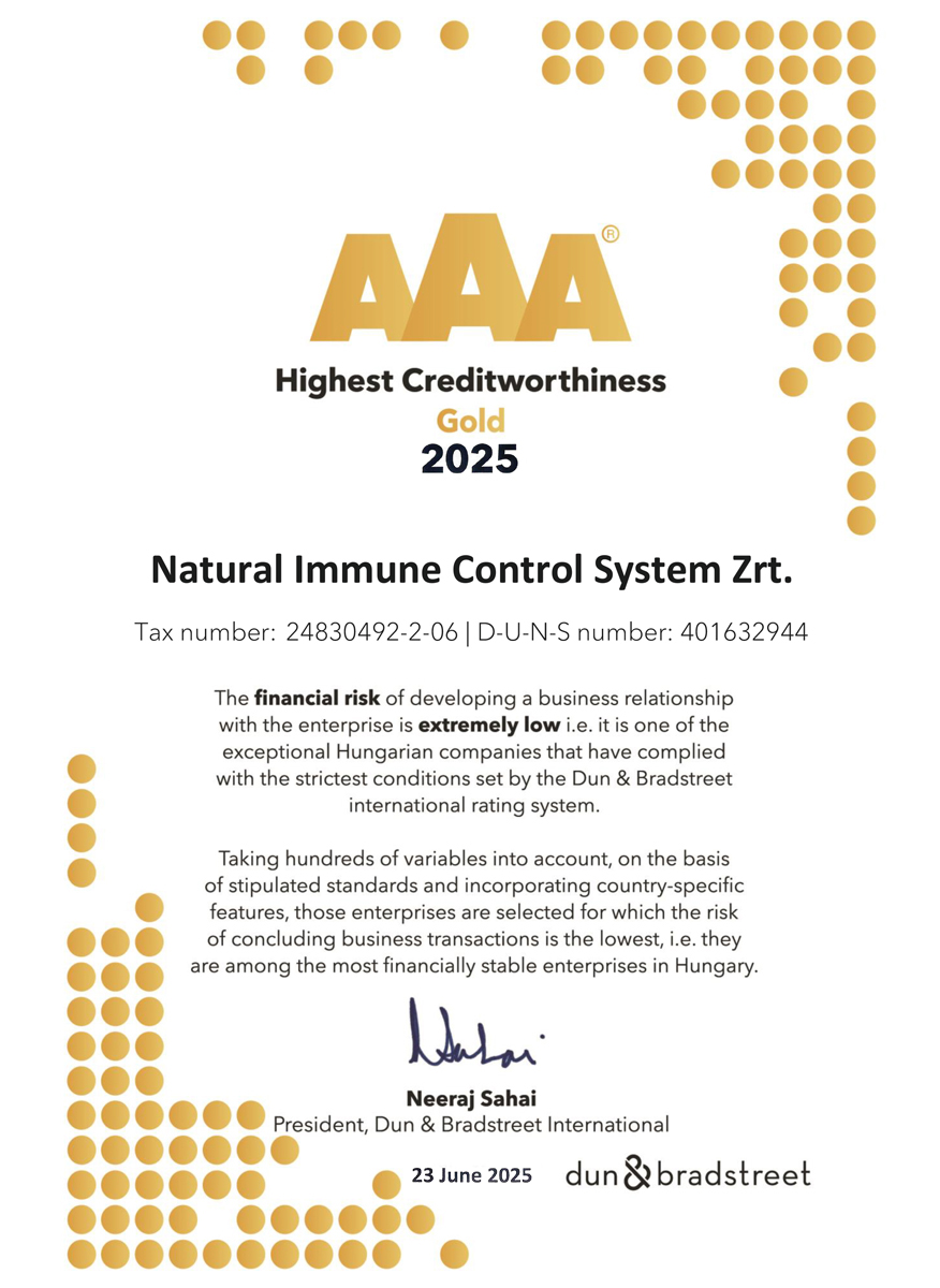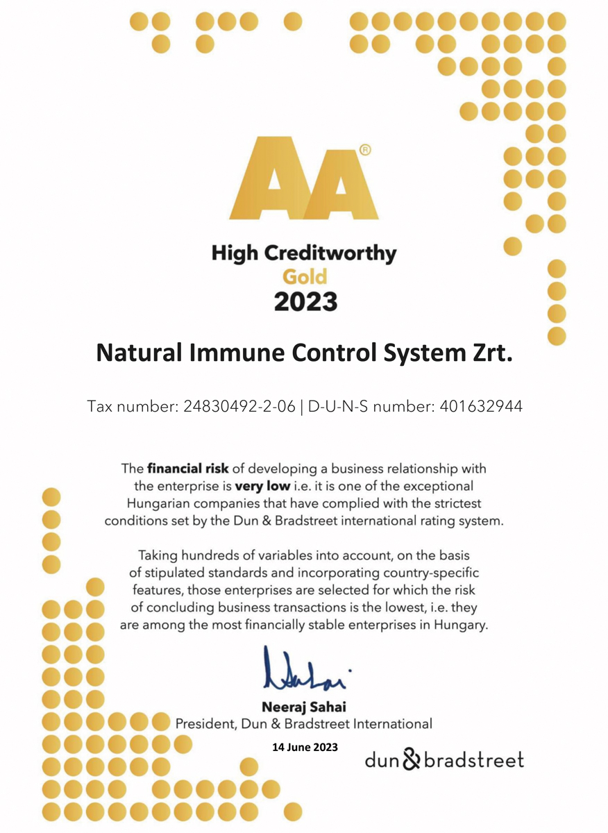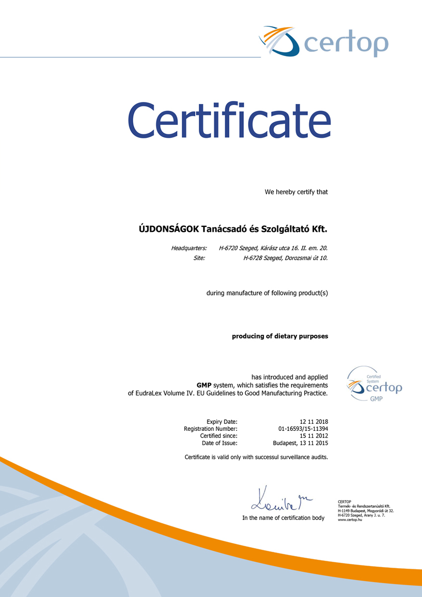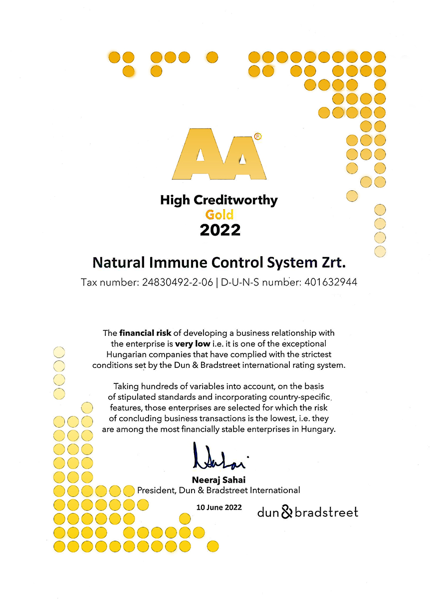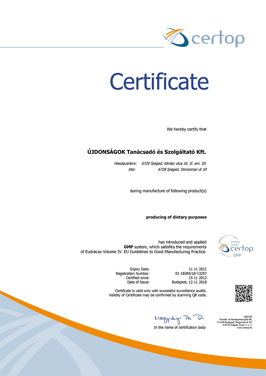 The production site, manufacturing the N.I.C.S. products, received in 2022 for the 11th time the GMP (Good Manufacturing Practice) certification. GMP is the internationally accepted, reliable and traceable standards in which the most effective guidelines, manufacturing procedures, control methods are collected in order to ensure the consistent product safety and quality. It is used generally in the pharmaceutical and food industries. National regulatory agencies coordinates inspections in a form of an audit in every single year to verify the compliance of the manufacturing sites.