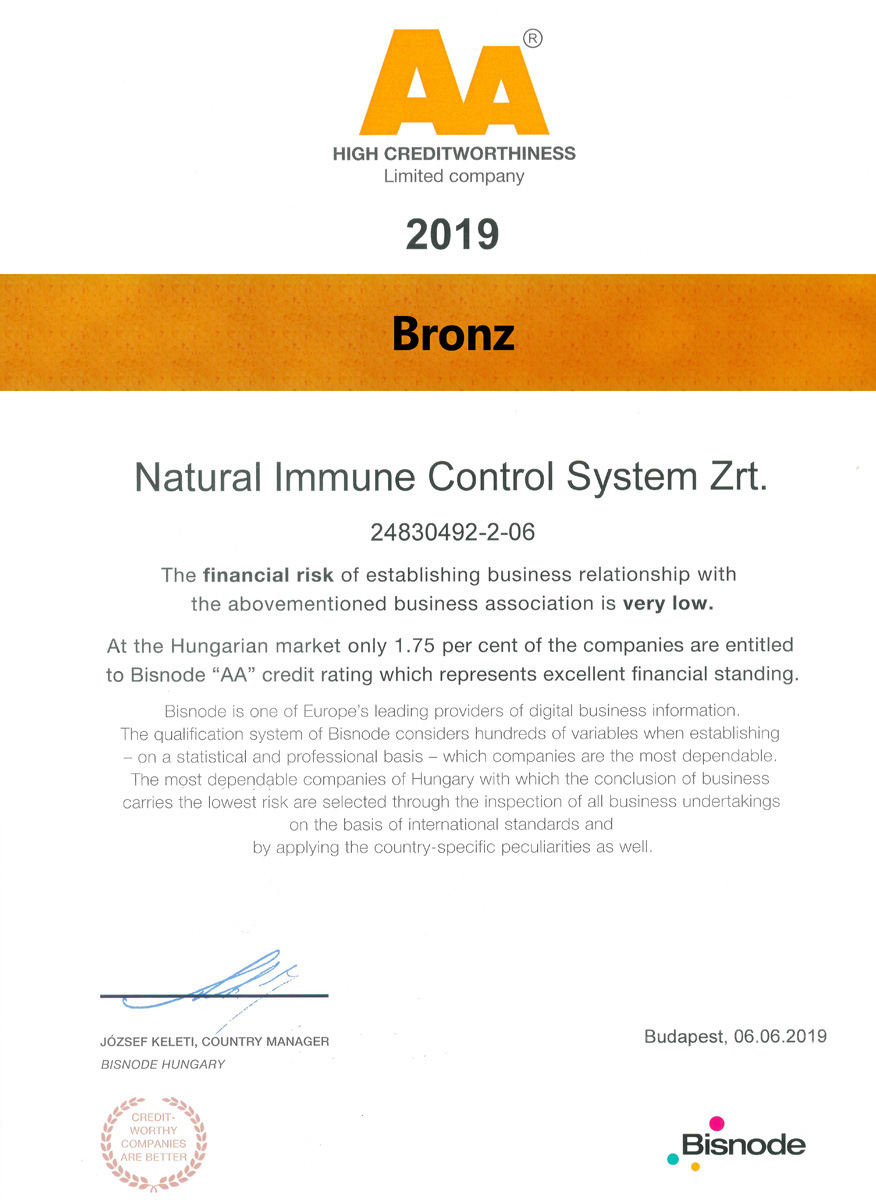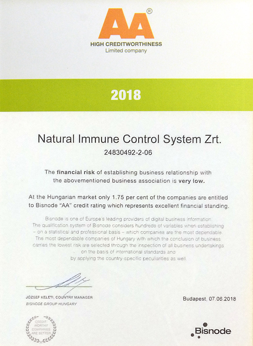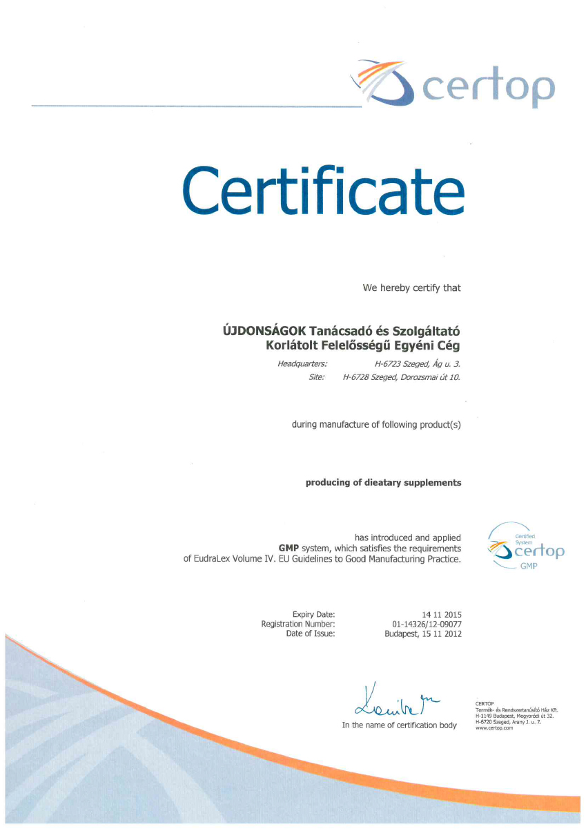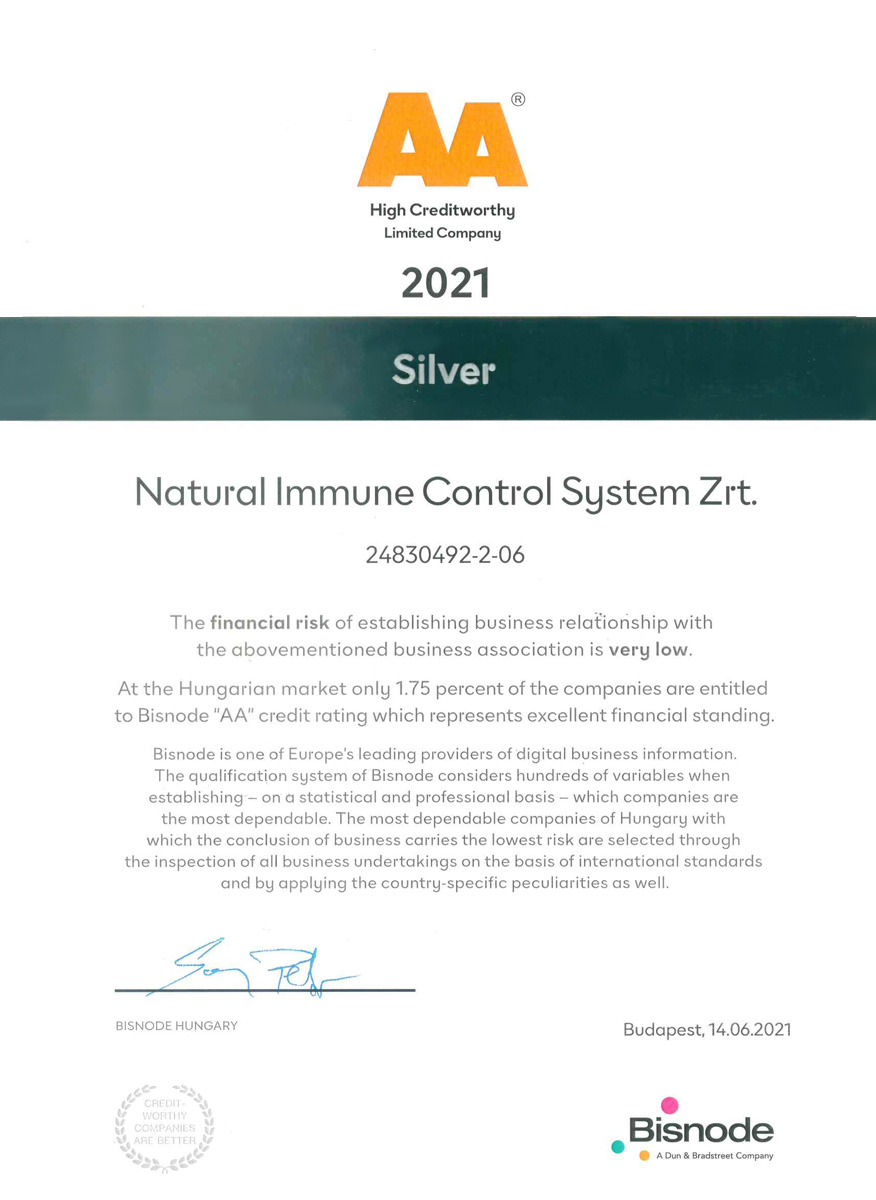 The production site, manufacturing the N.I.C.S. products, received in 2022 for the 11th time the GMP (Good Manufacturing Practice) certification. GMP is the internationally accepted, reliable and traceable standards in which the most effective guidelines, manufacturing procedures, control methods are collected in order to ensure the consistent product safety and quality. It is used generally in the pharmaceutical and food industries. National regulatory agencies coordinates inspections in a form of an audit in every single year to verify the compliance of the manufacturing sites.